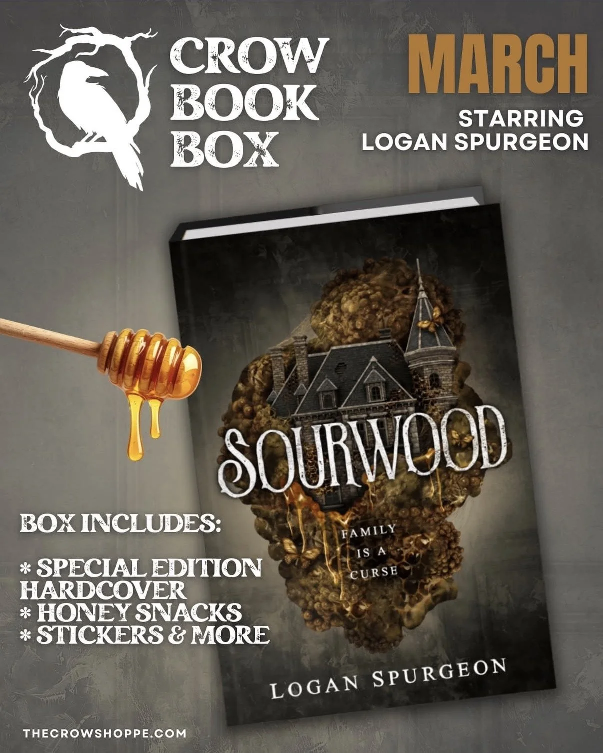 Last, but not least, my forthcoming gothic novel Sourwood will be in the Crow Book Box this March! It will include a special edition hardcover, honey snacks, stickers, and more. Order by February 25th from The Crow Shoppe. Boxes will ship after March 1st.